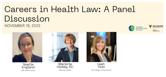 Join the CBA-NS Health Law & Law Students Sections, along with the Dalhousie Health Law Students' Association, for this important panel discussion and reception on November 19! The panel will highlight the range of career paths within health law, giving students the opportunity to hear from experienced professionals about launching their career, navigating different health law landscapes, managing day-to-day work, and other valuable insights. We look forward to hearing from Noelle England, Marjorie Hickey, KC, and Leah Hutt on their paths to the roles they fill today.
