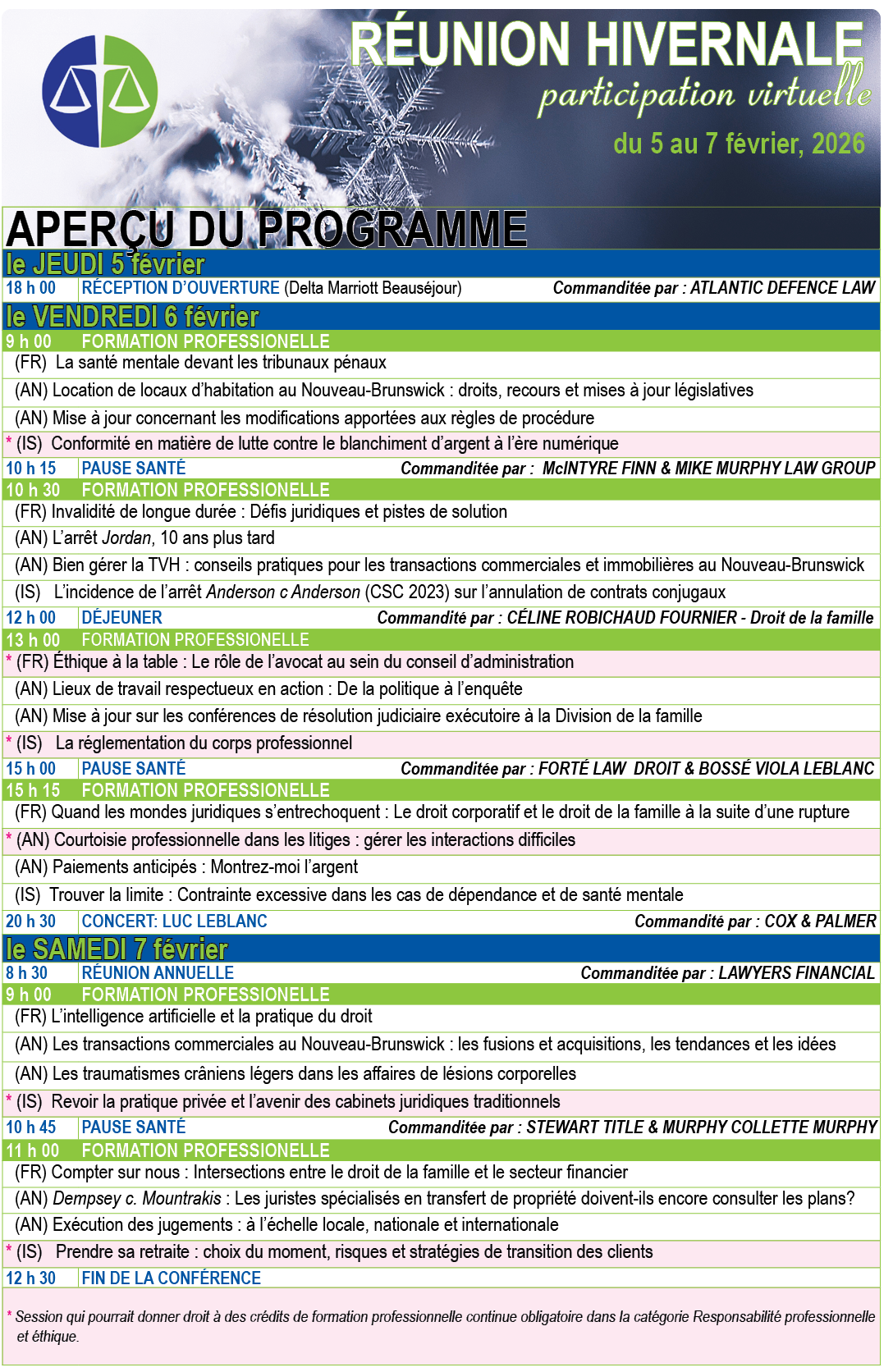 Inscrivez-vous pour le programme complet d'ici le 7 janvier 2026 pour profiter du tarif réduit et pour participer au tirage au sort pour la chance de gagner une inscription gratuite à la Réunion hivernale 2027.